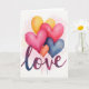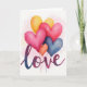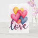 This card shows a bouquet of heart-shaped balloons floating near the top, painted in soft, watery color. Most of the hearts are pink and red, with two larger ones standing out at the center like the main pair. Mixed into the cluster are a deep blue heart, a smaller orange heart, and two yellow hearts peeking up near the top edge. The background is a light blush pink that keeps everything feeling warm and gentle. Near the bottom, the word “love” is written in smooth, flowing letters, shifting from dark indigo to fuchsia, and it sits centered under the balloons as if it’s tied to them. The brush marks and light texture make the scene feel real and tender, like a small moment you can hold onto. It’s a meaningful card to give because it says “I care about you” without needing a lot of extra words 🥰❤️. Hope it helps you share Valentine’s Day sentiments with someone special.