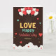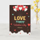 This greeting card features a rich chocolate-brown background topped with a cluster of glossy heart-shaped balloons in alternating red and white, floating upward on thin white strings. Centered beneath them, the word “LOVE” sits large in warm gold with a slight shadow that makes it look gently raised. Just below, “Happy Valentine’s Day” appears in coral flowing lettering, adding a soft, romantic flourish ❤️. Near the lower center, “14 February” is placed smaller and neatly spaced, like a quiet date note under the main message. Tiny hearts in red, mint green, and sunny yellow are scattered around like confetti, giving the scene a sweet, lighthearted energy 🥰. The lighting stays soft and cozy, with subtle shading on the balloons and letters that suggests depth without feeling heavy. Along the bottom edge, faint cloud-like shapes hover in a pale haze, creating a gentle base beneath the text and falling hearts.