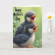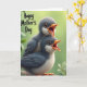 This greeting card shows two fluffy young birds centered in the scene, one perched slightly atop the other as they both turn their gaze to the right with an affectionate, close-together posture ❤️. Their beaks are open in bright orange, with a deep red inside that makes it look like they’re calling out in unison. Large, dark, glossy eyes catch the light, giving them a tender, trusting look that feels like a gentle bond. Soft feather textures shift from muted gray along their backs and wings to creamy white on their bellies, keeping the contrast calm and soothing. Behind them, a softly blurred wash of leafy greens in lime and deeper emerald suggests a quiet outdoor spot under diffused daylight. In the upper left corner, the words “Happy Mother’s Day” appear in black, flowing lettering that sits lightly against the green background 🌼. Their small orange feet curl around a slim branch, with fine feather details visible along the edges of their wings.