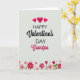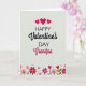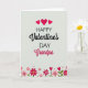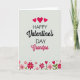 This Valentine's Day card features the message “Happy Valentine’s Day Grandpa” centered on a soft off-white background. “HAPPY” and “DAY” are in simple uppercase letters, while “Valentine’s” and “Grandpa” use a flowing, cursive-style look. The words “Valentine’s” and “Grandpa” are in a bright fuchsia tone that stands out right away. Near the top edge, three rounded red hearts float above the text like a sweet little accent ❤️. Along the bottom, a row of pink and fuchsia flowers stretches across the card, mixed with small heart-shaped buds, green leaves, and scattered red dots. The colors and gentle details make it feel caring and close, like a hug from across the miles 🥰.