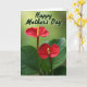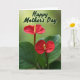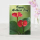 This design shows two red, heart-shaped tropical blooms side by side, their glossy surfaces catching soft light like a gentle embrace ❤️. Each bloom holds a slim, golden-yellow column at its center, creating a warm contrast against a blurred, deep green garden background. Large, dark green leaves with subtle veins spread beneath them, giving the scene a calm, sheltered setting that feels quietly affectionate. The background fades into smooth patches of light and shadow, keeping your focus on the pair as if they’re sharing a private moment. Near the top, the words “Happy Mother’s Day” appear in dark green flowing lettering, centered and easy to spot. A faint halo of lighter green around the text helps it stand out without overpowering the flowers 🌼. The red blooms sit in the foreground with crisp edges, while the emerald backdrop remains softly out of focus. The larger leaf curves upward along the lower edge, framing the two blooms like a natural border.