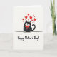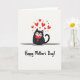 Designed with a rounded black cat as the main character, the artwork centers on its calm face with closed eyes and a small, content smile that reads like a quiet cuddle. The cat holds a bright red heart close to its chest with tiny paws, adding a tender, affectionate touch ❤️. Above its head, a scatter of red hearts in mixed sizes floats upward, like warm thoughts drifting into the air. The background is plain white, and a soft gray shadow beneath the cat gently anchors it to the page. Near the bottom, the words “Happy Mother’s Day!” sit centered in red lettering, easy to spot without crowding the illustration. The limited palette of black, white, and red keeps the focus on the sweet interaction between the cat and the heart, with a few hearts spaced wider to create a light, airy feel 🌼. Several small red hearts arc above the cat, forming a loose halo against the white space.