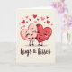 This greeting card shows two smiling heart characters hugging close in the center, one blush pink and the other deep red. Both hearts have closed eyes, small gentle smiles, and rosy cheeks that make the moment feel calm and loving. Simple black arms and legs give them a cute, storybook look, like they’re standing together for a sweet photo. Around them, several smaller hearts in different pink and red tones float above, filling the space with extra love. The background is a creamy off‑white with a light texture, so the hearts stand out without feeling busy. Near the bottom, the words “hugs & kisses” appear in a flowing, cursive-style lettering, set neatly under the hugging pair. It’s a meaningful card to give because it says “I care about you” in a straightforward, affectionate way 🥰❤️. Hope it helps you share Valentine’s Day sentiments with someone special.
