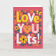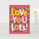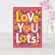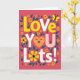 This Valentine's Day card features the words “LOVE YOU LOTS!” set on a deep berry-colored background. The letters are big and rounded, and they alternate between sunny yellow, white, and light pink with polka dots. In the word “YOU,” the “O” is replaced by an orange heart with closed, smiling eyes and rosy cheeks, which makes the message feel extra sweet 🥰. Teal leaves and small yellow daisies with darker centers are scattered around the text like a simple floral frame. A small yellow butterfly sits near the top right corner, adding a gentle touch to the scene. The message is easy to read and sits right in the center, so you notice it right away and feel the warmth behind it ❤️. It’s a meaningful card to give because it says a lot in a simple way, whether it’s for a partner, a close friend, or someone you miss. Hope it helps you share your Valentine’s Day sentiments.