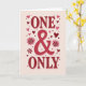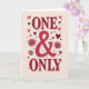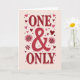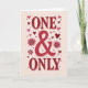 This greeting card centers on the words “ONE & ONLY” stacked in a tall vertical layout. The letters are thick and slightly raised-looking, with a soft shadow that makes them stand out from a creamy light pink background. “ONE” and “ONLY” appear in deep reds and crimson tones, and the big ampersand in the middle ties the two parts together. Small hearts in different sizes are scattered around, ranging from rich ruby red to pale blush pink. On either side of the ampersand, you’ll notice simple flower shapes with layered petals that echo the depth of the lettering. The overall look feels warm and romantic, like a clear way to say someone is truly special to you ❤️. It’s a meaningful card to give when you want your feelings to be direct, sweet, and easy to understand 🥰. Hope it helps you share your Valentine’s Day sentiments.