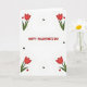 This Valentine's Day card features a white background with four red tulips placed neatly in the corners, their crimson petals and bright green stems drawing your eyes toward the middle 🥰. Small red hearts float near each tulip like little kisses in the air, adding a gentle romantic touch without crowding the space ❤️. In the center, the message “HAPPY VALENTINE’S DAY” sits as the main focal point in solid red lettering. The text is set on a straight line and feels balanced between the corner flowers, as if the tulips are framing it for someone special. Scattered around the design are a few tiny black hearts that add contrast and keep the layout from feeling too sweet or uniform. The overall scene feels calm and affectionate, with the clean white space giving the flowers and hearts room to breathe. Each tulip has slightly curved leaves that angle inward, and the little hearts appear in small clusters around the corners. The final look is a centered red greeting surrounded by corner tulips, with red and black hearts sprinkled across the white field.