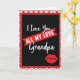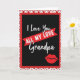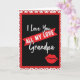 This card shows a black rectangle in the center with a strong love message in white and red. The words “I Love You” sit near the top in white, in a flowing letter style that feels gentle and close. Across the middle, a red diagonal banner cuts through with “ALL MY LOVE” in white capital letters, making the message feel direct and sure ❤️. Near the bottom, “Grandpa” appears in the same flowing white lettering, tying the whole note together. A small red lips icon rests in the lower right corner like a quick kiss 🥰. The black center is outlined by a thin red border, and outside that is a wider frame filled with a repeating red-and-white chevron pattern.