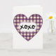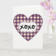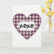This card shows a single heart centered on a white background, keeping the focus on love and closeness. The heart is filled with a gingham check pattern in deep aubergine purple and soft creamy yellow, like a cozy quilt or picnic cloth. Near the middle, the checks fade into an uneven white oval that looks softly worn, creating a gentle spotlight. Inside that white area, the text “xoxo” appears in black, in a loose hand-drawn letter style, placed right at the center. The slightly faded look around the words makes it feel like a quiet, familiar note rather than something formal. It’s a meaningful card to give because it says “hugs and kisses” in a simple way that fits romance or close friendship 🥰. The warm colors and classic pattern make it feel comforting, like a small reminder that someone is thinking of you ❤️. Hope it helps you share your Valentine’s Day feelings with someone special.