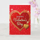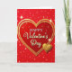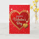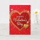 On the front of the card a large crimson heart sits center stage, shaded with a gentle inner gradient that makes it feel full and warm ❤️. A double gold outline traces the heart’s edge, giving it a rich, brushed look against the red background. Inside the heart, “Happy Valentine’s Day” is centered, with “Valentine’s” in flowing cursive-style lettering and the surrounding words in a classic serif. A smaller gold heart with an embossed, raised look rests in the lower-right curve of the main heart, like a sweet little accent meant just for someone special 🥰. Behind everything, the red field is sprinkled with soft white dots that resemble bokeh, plus a few crisp four-point starbursts. The mix of deep red and shimmering gold creates an intimate, celebratory feel that suits both romance and close friendship. It’s a simple, glowing way to share Valentine’s Day feelings with someone you care about.