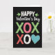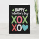 This card features a dark, inky black background with cheerful lettering that feels like it was drawn with chalk. Near the top, the text reads “HAPPY Valentine’s Day,” with “HAPPY” in thick, worn-looking white capital letters. Small light green arrows sit around “HAPPY,” pointing inward and adding a fun little accent. Right beside it, “Valentine’s Day” appears in smooth, flowing white cursive, giving the heading a softer, romantic feel ❤️. Below that, large “XOXOXO” letters fill the center, alternating between pale green and muted pink, with one bright white “O” standing out. At the bottom, the last row ends with a red “X,” a white “O,” and a robin’s egg blue heart that looks lightly scuffed, like it’s been sketched by hand 🥰. It feels meaningful because it’s simple, affectionate, and says “I care about you” without needing a lot of extra words—perfect for sharing Valentine’s Day sentiments.