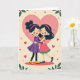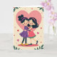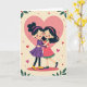 This design shows two cartoon-like figures hugging closely, their cheeks marked with tiny heart blushes that hint at a sweet bond ❤️. Behind them sits a large, soft pink heart like a gentle backdrop, set on a warm cream background. Small hearts in light pink and red drift around the scene, adding to the sense of closeness without crowding the space. Dark green leafy branches curl into the top and bottom corners, creating a natural frame that feels calm and cozy 🌼. One figure wears a purple dress with small dot patterns, a dark updo, and a bright pink headband, smiling with eyes closed as she leans in. The other figure wears a pink dress with a green trim at the hem, returning the embrace with the same closed-eyed grin, and their arms wrap around each other at center. There is no visible headline text, leaving the artwork to speak for itself, while one pair of shoes is sunny yellow and the other is deep blue beneath the figures.