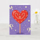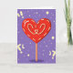 This greeting card shows a red, heart-shaped lollipop centered on a lavender background. The heart has a white dashed outline around the edge, like little icing marks, and it looks neat and sweet. In the middle, a creamy white swirl curls inward and ends in a tiny heart, which makes the design feel extra caring ❤️. The lollipop sits on a warm orange stick, with a soft dark-purple shadow underneath to give it a bit of depth. Around it, small dots in white and pale yellow are scattered across the background, like confetti floating in the air. A few larger pale-yellow shapes, almost like exclamation marks or simple music-note forms, add a fun sense of movement. There isn’t any text on the front, so the picture does all the talking and leaves room for your own words 🥰. It feels meaningful because it’s simple, sweet, and clearly about love, making it easy to share Valentine’s Day sentiments.