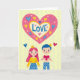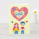 This design shows a large fuchsia heart at the top, outlined in sunny yellow, with the word “LOVE” centered inside it in friendly blue letters ❤️. Around the big heart, smaller patterned hearts in blues, yellows, and pinks scatter like confetti, adding a sweet, cozy energy. Below, a boy and girl stand close against a pale yellow background with subtle swirling shapes that echo an embracing motion. Both wear tiny golden crowns, and their warm smiles and gentle lean toward each other suggest an easy, romantic closeness 🥰. The girl has flowing magenta hair, a marigold top, and a sky-blue skirt dotted with deeper blue circles, her eyes turned toward the boy as if sharing a private moment. The boy has neatly styled blue hair and holds a bright fuchsia heart to his chest, with matching polka-dot pants that mirror her outfit. The “LOVE” text sits high in the upper section inside the main heart, while the couple and their crowns anchor the lower half of the scene. Behind them, the pale yellow backdrop is lightly decorated with soft, curling swirls.