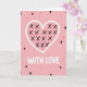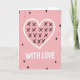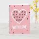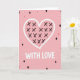 This greeting card features a large hand-drawn heart centered on a soft pastel pink background, outlined in thick white with slightly uneven edges that make it feel tender and close-up 🥰. Inside the heart, dark black X marks are scattered like quick kisses, giving the design an easy, affectionate energy ❤️. Just below the heart, the words “WITH LOVE” sit in chunky white letters, centered and clearly spaced so they read at a glance. Around the main image, small confetti-like shapes float with lots of breathing room, keeping the look simple and sweet rather than busy. You’ll spot solid black diamonds mixed with white-outlined diamonds filled with pink, creating a gentle contrast against the pale backdrop. Tiny pink flecks dot the space like soft sprinkles, adding a light celebratory touch without stealing focus from the heart. The limited palette of pink, white, and black keeps everything cohesive and warm, like a quiet moment shared between two people. The front is finished with scattered diamonds and flecks around the heart and the centered “WITH LOVE” text in white.
