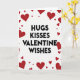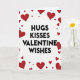 This Valentine's Day card keeps things simple and sweet, with a white background covered in red hearts. In the middle, the words “HUGS KISSES VALENTINE WISHES” are stacked in a neat vertical column. The letters are black, all caps, and look like a straightforward sans-serif style, making the message easy to read. Around the text, hearts in different sizes are scattered across the front, and a few are cut off at the edges like they keep going beyond the card. The red hearts have light shading that gives them a slightly raised, soft look. It feels like a warm shower of love surrounding a direct message, which makes it easy to give to a partner, friend, or anyone you care about 🥰❤️. It’s a simple way to share Valentine’s Day sentiments.
