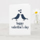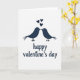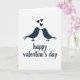This greeting card shows two stylized birds in deep navy blue facing each other, with their beaks touching like a gentle kiss. Their tiny white eyes stand out as little dots, giving them a sweet, attentive look. Above the birds, three navy hearts float upward in a loose line, like love rising into the air. The background is plain white, which keeps the focus on the couple and the hearts. Near the bottom, the words “happy valentine’s day” appear in a flowing, cursive-style navy lettering that looks like it was written with ink. The navy shapes have a slightly grainy, stamped texture, which adds a cozy, human feel without needing extra details. It feels meaningful to give because it captures a quiet moment of closeness and care that fits romance or friendship 🥰❤️. Share it to help pass along Valentine’s Day feelings in a simple, heartfelt way.