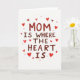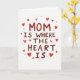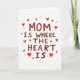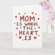 This greeting card features the phrase “MOM IS WHERE THE HEART IS” centered on a bright white background, giving it lots of open space to breathe. The lettering looks hand-drawn with brushy strokes, shifting between deep maroon and brighter red, like a note written with extra care ❤️. The words are stacked in the middle, with “MOM” standing out most, and the rest arranged beneath it in the same style. Around the text, small heart shapes scatter near the edges, creating the feel of a gentle shower of affection. Some hearts are pale and slightly see-through, while others are a stronger scarlet, adding a soft rhythm across the page 🌼. The mix of reds and the loose placement of the hearts suggests closeness and a tender bond without needing any characters on the front. The hearts vary in size and sit like a loose border around the centered message on the white field.