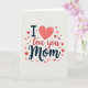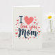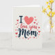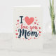 This card features the phrase “I ❤️ love you Mom” centered on a soft cream background, with the words arranged to feel close and affectionate like a warm hug. The “I” sits at the left in a dark, solid style, followed by a coral heart icon ❤️ that stands in for the word “love” and draws the eye right away. Next, “love you” appears in a flowing, pen-like look that leans gently forward, as if it’s being written in the moment. “Mom” is placed at the end in a thicker, decorative blue lettering that feels steady and caring, balancing the darker “I” at the start. Around the main line of text, small hearts scatter in different sizes, adding a sweet, friendly flutter without crowding the words. The hearts range from deep red to light pink, creating a soft gradient that suggests tender closeness, with a tiny 🌼 of brightness in the overall palette. The letter edges and heart outlines have slightly uneven strokes, giving the design a cozy, drawn-by-hand look. The final detail is a loose halo of red and pink hearts framing the text from the upper left to the lower right.