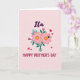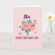 This card features a sweet digital illustration centered on a tied bouquet with two large, round-petaled flowers in soft pink, each with a sunny yellow center that feels like a warm gaze ❤️. Slim green leaves and stems curl around the blooms, with a few small red buds tucked in like quiet little compliments between close friends or family. The background is a pale blush pink with faint, cloud-like shapes that keep the scene light and airy. Small red hearts float around the bouquet, adding a gentle, affectionate tone without taking over the design. Near the top, a name appears in a flowing dark tone, placed above the flowers and easy to spot. Beneath the bouquet, a short message sits in cherry-red lettering, centered and balanced with the artwork 🌼. A tiny striped flying insect rests on one of the pink petals, its wings drawn small against the soft pink bloom.