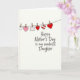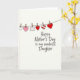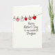 This greeting card features a warm off-white background with a simple, intimate layout that feels like a quiet note shared between close family 👩. Centered on the page is the message “Happy Mother’s Day to my wonderful Daughter,” written in a flowing, handwritten-style line in a dark ink tone. Near the top third, a thin curved line stretches across like a small clothesline, suggesting a gentle, caring display. Hanging from it are tiny keepsakes held by little clothespins, arranged as if someone carefully placed them there with affection ❤️. Most of the hanging shapes are hearts in a mix of white outline, soft blush pink, rich red, and a red-and-white striped heart that adds a sweet rhythm. Among the hearts, there’s one small square tag decorated with tiny red polka dots, giving the arrangement a friendly, letter-from-home feel 🌼. The hearts and tag hang evenly spaced beneath the curved line, each clipped with a lightly sketched pin in a natural wood tone.