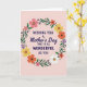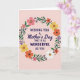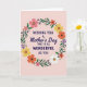 This greeting card features a soft pastel pink background with a circular wreath of flowers and leaves that feels like a gentle hug ❤️. In the center, the main message reads “WISHING YOU A Mother’s Day THAT IS AS WONDERFUL AS YOU,” arranged in stacked lines so the words fill the space evenly. The larger words sit prominently in the middle, while smaller words tuck above and below, creating a close, affectionate rhythm like a warm conversation. The lettering appears in dark ink for strong contrast, making it easy to read against the light backdrop. Around the text, stylized blossoms in rose, marigold, tangerine, lavender, and white lean inward as if admiring the message together 🌼. Deep green leaves weave between the blooms, with a few small berry-like dots adding quiet texture. Several flowers have darker or golden centers that echo little points of attention around the ring. The wreath forms a neat circle with evenly spaced petals and leaves framing the centered text.