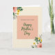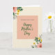 This card features a soft blush-pink rectangle centered on a creamy, lightly textured background with faint vertical lines, creating a gentle, cozy setting ❤️. A thin white border outlines the pink panel, giving it a neat frame against the warm neutral backdrop. In the upper left corner, a cluster of airy flowers leans inward as if offering a quiet hello, with layered pale pink blooms and fresh green leaves. The lower right corner mirrors that flourish with more petals and foliage, creating a balanced, friendly conversation across the page 🌼. Tucked among the larger blossoms are small yellow flowers with darker centers and a few lavender-tinted buds, adding subtle contrast without crowding the space. The top line of text sits near the upper portion of the pink panel in a simple sans-serif style and reads “WISHING YOU A VERY” in green, while “Happy Mother’s Day” appears below it in a flowing, cursive-like style in a deeper green. The watercolor-style petals show soft shading and gentle edges, and the greenery curls around the corners toward the central panel.