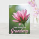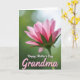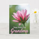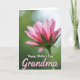 This card features a tall, vertical close-up of a pink daisy-like flower centered against a softly blurred green garden background. The bloom tilts slightly upward, its many petals spreading in layers of fuchsia and rosy tones that feel like a gentle hug ❤️. Soft natural light filters through the petals, showing faint inner lines and giving the flower a tender, almost glowing look. Near the top, the message “Happy Mother’s Day Grandma” sits clearly over the background in a light-colored, slightly raised-looking style that stands out without overpowering the image. The shallow focus turns the greenery into smooth patches and tiny light circles, like a quiet moment shared between loved ones 🌼. At the base, the stem and small green sepals appear darker and sharper, grounding the bright blossom. The background stays muted in soft greens with scattered bokeh dots behind the flower.