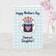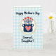 This card shows a dark navy pot or mug centered on a soft pale-blue-and-white check pattern, giving the scene a cozy, close-to-home feel ❤️. A red-and-white checked heart sits on the front of the pot, like a small patch that hints at affection and familiarity. From the opening, several slender, dark stems rise like a simple bouquet, each topped with a tiny red heart that reads as flowers offered with a gentle, friendly devotion. A thin double-ring circle in warm gold surrounds the main image, like a keepsake frame holding the moment in place. The gingham background continues out to the edges, where a dashed golden-brown border adds a stitched, textile-like touch 🌼. The greeting text is placed above the illustration in rounded, flowing letters, while a family address line sits below in the same style, both in a deep, easy-to-read color. The overall palette balances cool blues with warm reds and golds, letting the hearts feel like small, affectionate gestures tucked into an everyday setting. The top line of text arches over the gold circle, and the lower line rests centered beneath the pot.