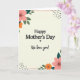This card features the message “Happy Mother’s Day” centered in black, followed by a tiny black heart ❤️. Just below, “We love you!” sits in a flowing cursive style, also in black, like a gentle note tucked under the main greeting. The background is a creamy off‑white that keeps everything soft and easy to read. In the top-left and bottom-right corners, stylized flowers in coral pink and warm orange lean inward with deep, muted green leaves, as if they’re reaching toward the words. Opposite them, small black polka dots gather in the top-right and bottom-left, adding a light, friendly rhythm 🌼. A thin pink line traces near the edges, occasionally slipping behind the flowers like a quiet frame. The pink border line is most noticeable along the sides where it curves around the corners.