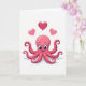 This card shows a bright pink octopus centered on a white background, drawn in a soft cartoon look with a wide dimpled smile and big eyes that catch the light 🥰. Tiny eyelashes and crisp white highlights in the eyes add a gentle, affectionate expression, like it’s gazing up at someone it adores. Its eight tentacles curl and swirl outward in smooth loops, with lighter pink suction cups dotting the undersides for texture. Above the octopus, three floating hearts hover in a row, shifting from pale blush to deeper magenta ❤️. The greeting text sits above the hearts in a rounded pink font, while a smaller line of text is placed near the bottom in a lighter pink to keep the focus on the character. A soft gray drop shadow beneath the octopus gives it a grounded, slightly lifted look against the plain white space. The hearts have a glossy gradient shine, and the octopus’s body shows subtle pink shading along the curves of its head and arms.