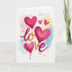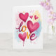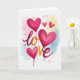 This greeting card centers on the big word “LOVE” stretched across the middle in thick, brushy lettering. The “L” and the final “E” are a deep magenta, while the “O” and “V” are a warm orange, giving the word a two-tone look. Around the word, there are many hearts in rose and fuchsia, some large and some tiny, scattered like confetti. A few hearts look freshly painted, with little paint drips that make them feel honest and a bit tender. The background is a soft wash of pastel pink, light blue, and pale yellow, like watercolor clouds. Small dots and short radiating marks are sprinkled around the page, adding a sense of happy motion. Giving this card feels meaningful because it says “LOVE” clearly while still feeling gentle and caring 🥰❤️. Hope it helps you share Valentine’s Day sentiments with someone you care about.
