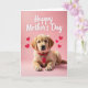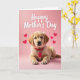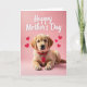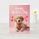 At the center of the card is a golden-coated puppy with dark, gentle eyes looking straight at the viewer against a calm pink background. The pup lies low on the soft surface with its front paws tucked in, giving it a shy, affectionate posture that feels like a quiet cuddle ❤️. Above the puppy, the words “Happy Mother’s Day” appear near the top in white, flowing lettering that stands out clearly against the pink. Around the pup, scattered red heart shapes add a romantic, caring touch, like little love notes floating nearby 🌼. Soft, diffused lighting highlights the puppy’s plush fur and small, shiny nose without harsh shadows. A bright red collar circles its neck, and a small matching tag hangs at the front as a crisp pop of color. The hearts sit mostly to the sides and around the puppy, leaving the center open so the face stays the main focus. The overall scene stays simple: pink background, white message at the top, red hearts around, and the puppy centered with a red collar and tag.