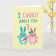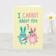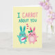 This card features a minimalist digital illustration on a soft pale yellow background, centered on two friendly, rabbit-like characters 🐰. The left character is teal and stands in an open, welcoming pose while holding up a bright pink carrot with a leafy green top, as if offering it to someone special. Beside it, a bubblegum-pink rabbit with rosy cheeks and dot eyes wears an emerald green bow, leaning slightly toward its companion in a way that suggests closeness. Between them, three small magenta hearts float upward, adding a gentle romantic or best-friend touch without needing extra detail. Across the top, the phrase “I CARROT ABOUT YOU” is written in casual, hand-drawn lettering, with “CARROT” colored in the same pink as the right character for emphasis 🌷. The simple faces and rounded shapes keep the scene light and sweet, while the teal-and-pink pairing feels balanced against the sunny backdrop. The hearts rise in a neat line between their heads, and the text sits centered above the pair in dark lettering with the pink highlight on the key word.