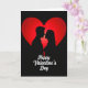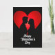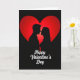 This Valentine's Day card shows two black silhouettes, a man and a woman, leaning in close with their faces almost touching. Behind them is one large red heart that glows brighter in the middle and gets darker toward the edges. The background is solid black, which makes the couple and the heart stand out right away. The woman’s hair curves outward in a few soft curls, adding a gentle detail to the simple shapes. Near the bottom, the words “Happy Valentine’s Day” appear in white cursive lettering, centered under the couple. The close pose and the quiet scene feel like a private moment, which makes the card meaningful for a partner or someone you care about 🥰. It says a lot without showing too much, leaving room for your own feelings ❤️.