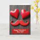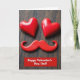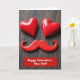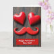 This card shows two shiny red heart shapes near the top, catching soft light so they look smooth and glossy. Just below them sits a red mustache shape, making the hearts and mustache look like a simple face with a sweet little smile. Everything is arranged on a dark, worn wood surface with visible grain and small marks that add a cozy, homey feel. The strong red shapes stand out against the deep brown background, which keeps your eyes on the “face” right away. At the bottom, a red banner carries the words “Happy Valentine’s Day, Dad!” in clear light lettering, centered and easy to read. It feels meaningful because it’s a gentle, funny nod to a dad while still being full of love ❤️. Giving it says “you’re appreciated” without needing a long message, and it can fit both affection and friendship in a family way 🥰. Hope it helps you share Valentine’s Day sentiments with someone you care about.