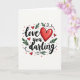This card features the words “Love you darling” centered on a white background in flowing black lettering that looks like it was drawn with a pen. The “o” in “Love” is replaced by a large red heart with a thin black outline, making the message feel extra sweet ❤️. Around the main words, several smaller red hearts are scattered like little reminders of affection. Dark green leafy sprigs sit between the hearts and letters, adding a gentle, natural touch to the layout. Tiny red dots are sprinkled across the background, like confetti or berries, giving the whole design a light, happy feel. The mix of red, black, and green keeps it simple while still feeling full of love. It’s a meaningful card to give because the message is direct and tender, and the hearts make it easy to say what you feel 🥰. Hope it helps you share Valentine’s Day feelings with someone you care about.