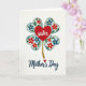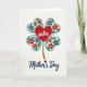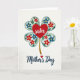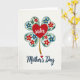 This card features a white background with a four-lobed clover-like shape made of four soft aqua hearts, each lightly shaded along the edges for gentle depth. Inside the heart shapes, small red and blue flowers with golden centers curl around green leaves and thin winding vines, like a bouquet being carefully tucked into place. Centered over the floral cluster sits a bright red heart that carries the word “sister” in flowing white lettering, giving the layout a close, affectionate feel ❤️. A textured golden stem drops down from the lower edge of the motif, like a single bloom being offered with quiet care. Beneath the illustration, the words “Mother’s Day” appear in deep indigo, placed near the bottom and written in smooth connected lettering. A tiny red heart sits beside the phrase as a sweet accent, like a small secret shared between loved ones 🌼. The overall palette balances aqua, ruby red, sapphire blue, emerald green, and gold against the open white space, with the indigo text anchored below.