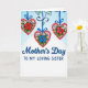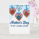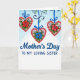 This card features three pink heart ornaments hanging from a curved deep-blue vine with small green leaves, like a gentle garland meant for someone you hold close ❤️. Each heart has a shiny cherry-red bead-like border that adds texture, while bright sapphire-blue ribbons drop down and tie into neat bows above each shape. Inside the two outer hearts, a rich red flower sits beside smaller white and pale sky-blue blooms, tucked into fresh green leaves, suggesting a caring bond shared between sisters. The center heart swaps in a striking blue flower, giving the trio a balanced, affectionate rhythm as your eyes move from one to the next. The background fades from soft sky blue at the top to glowing white near the bottom, keeping the scene light and airy 🌼. Below the hanging hearts, the words “Mother’s Day” appear in flowing deep-blue lettering, with “TO MY LOVING SISTER” set underneath in tidy uppercase blue text. The message sits centered under the artwork, leaving comfortable open space around it so the design feels calm and tender. The three bows are a saturated blue, and the hearts appear evenly spaced across the upper half of the front.