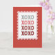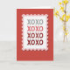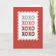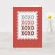 This greeting card shows a postage-stamp design centered on a deep crimson background with a lightly textured look. The stamp has a white middle, a wavy pink border, and a perforated edge that makes it feel like a real stamp. A soft shadow underneath gives the stamp a slight lifted effect. Inside the stamp, the text “XOXO” is repeated in a simple sans‑serif letter style, stacked down the center. The letters shift in color from light gray at the top through pink and red shades to a darker crimson at the bottom, like the message is growing warmer. It feels meaningful because “XOXO” is an easy way to say hugs and kisses when you want to keep things simple but still affectionate 🥰. Share it to help someone feel loved and remembered this Valentine’s Day ❤️.