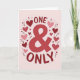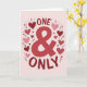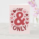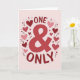 This greeting card centers on the words “ONE & ONLY” in large red letters, with an ampersand that stands out right in the middle. The text sits in the center of the front, easy to read, and the strong red color makes it feel direct and loving ❤️. Around the words, there’s a ring of small hearts in shades of red and pink that gently frames the message. Each heart has little dashed lines inside, like simple stitching marks, which adds a cozy, cared-for feel. Tiny sprigs of leaves are tucked between a few hearts, giving the design a soft, natural touch. The background is a light blush pink, so the reds feel warm without being too intense. It feels meaningful to give because it says “you’re my one and only” in a clear way, while the surrounding hearts make it feel tender and supportive 🥰.