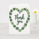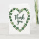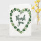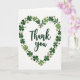 Designed with a heart-shaped wreath of shamrocks, this St. Patrick’s Day thank-you card frames the message like a gentle embrace between friends 💚. The setting is a soft white background that lets the leafy heart stand out without distraction. The wreath is made of layered clover leaves in many greens, from light lime to deep forest, giving the foliage depth and a cozy, close-in feel. Tiny gold details—berry-like dots on thin vines and scattered specks—add a light shimmer that feels like a quiet celebration ☘️. In the center, the words “Thank you” sit neatly within the open space, placed right in the middle of the heart. The text is in a flowing, handwritten-style font and colored deep green to match the darker leaves around it. Gold flecks sparkle along the wreath’s curves, especially near the upper left and lower right edges.