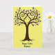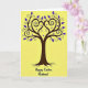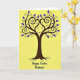 This design shows a stylized tree centered on a sunny yellow background, setting a bright, friendly scene with a gentle romantic tone. A deep brown trunk with subtle roots anchors the image, as if steadying two people who lean on each other through the seasons. Above, dark curling branches spread into a neat canopy shaped like two connected hearts, suggesting a tender bond without needing extra words 🌷. Pointed purple leaves cluster along the branches, and small round purple dots sit between them like berries, adding a rhythmic, decorative touch. The contrast between the yellow ground and the purple details makes the heart-shaped canopy stand out, like two close friends sharing one quiet space. Along the bottom edge, a short greeting appears in dark cursive-style lettering, centered and easy to spot. The final detail is the pair of linked heart shapes formed by the upper branches, outlined by swirling dark lines and framed by purple leaves 🐇.