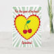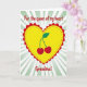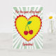 This greeting card shows a big yellow heart in the center, outlined with a scalloped red edge and a small dotted line just inside it. Inside the heart sit two plump red cherries with a shared green stem and a single leaf, like a sweet little symbol of togetherness. The background is made of light green and white stripes that spread outward like gentle rays behind the heart. At the top, the card reads “For the queen of my heart” in rounded red cursive-style lettering. ” in the same red lettering, placed right under the heart so it feels direct and loving. The bright colors and simple shapes make the message easy to read and hard to miss, and it feels like a caring way to honor someone who means a lot. It’s a lovely choice when you want to show affection and appreciation in a straightforward way 🥰❤️.