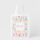 Grocery tote with a delicious and whimsical pattern. Hearts, love letters, muffins, tulips and cherries bring joy and happiness to this cute little pattern. Pretty pastel colors. A white square with a faux gold foil border layered over top with your text inside.
