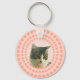 Cute tabby cat surrounded by heart circles on coral pink background. Photo can be customized.
