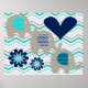 A colorful nursery poster features three gray elephants with chevron striped or polka dotted ears on a chevron stripe background of white, teal blue, and gray with flowers and hearts of navy and teal blue.