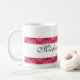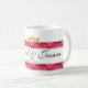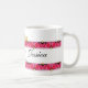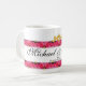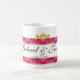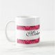 With original artwork by ZoeSPEAK designed for lovers, this Mug is bordered top and bottom by a band of pink roses and golden hearts. In the center of the upper band of roses there are two bows of golden ribbon which form a heart where they join in the center. Two gold hearts join the bows in the center, completing the design. The names of the couple are in black script on the white background between the roses, with the special date below. All text is set to be personalize.
