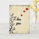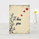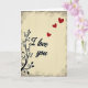 This greeting card features the words “I love you” in flowing black letters near the center, with a faint light outline that helps the text stand out. A black vine with curling stems and small leaves runs up the left side, like it’s gently growing along the edge. The background is a warm, creamy beige with light vertical lines that look like a soft, worn surface. Around the outside, there’s a darker, slightly worn border that frames everything and gives it an older look. Three red hearts float diagonally toward the upper right, getting smaller as they rise, which adds a sweet sense of motion 💘. The mix of beige, black, and red keeps the design simple but clearly romantic ❤️. It’s an easy card to give when you want to say “I love you” without adding a lot of extra words, and it’s a lovely way to share Valentine’s Day sentiments.
