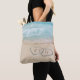 Modern tropical beach tote bag featuring sand, sea, and two hearts in the sand with your initials.