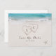 Features two hearts in the sand and the bride's and groom's initials with turquoise water and white sand beach background, great save the date cards for summer beach wedding, or tropical destination wedding.